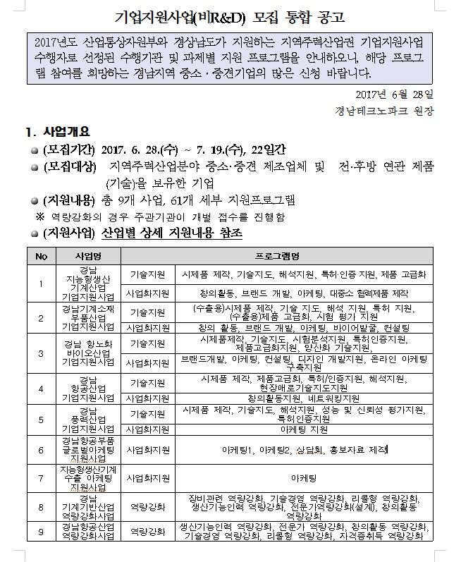 2017년도 경남 주력산업 기업지원사업 (비R&D) 수혜기업 신청 안내 페이지 정보 작성자 경남지회 작성일17-07-06 10:18 조회6,079회 댓글0건 첨부파일 붙임1.공고_3[1].hwp (320K) 붙임2.산업별상세지원내용(최종본)2.hwp (54.5K) 붙임3-1.2017년도_기업지원서비스사업_수혜기업지원신청서서식.hwp (28.5K) 111.jpg (229.1611328125K) 관련링크 이전글 다음글 목록 본문 이전글 다음글 목록