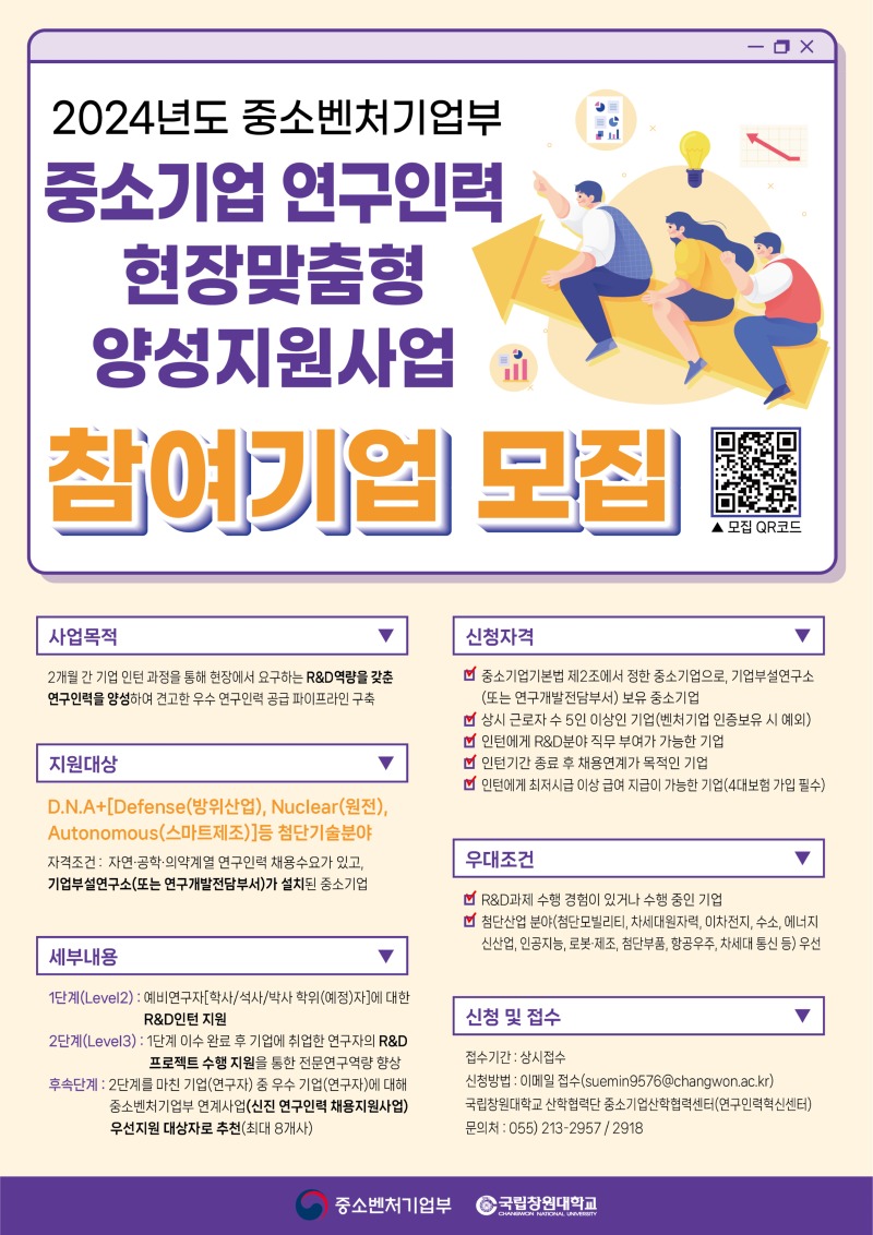 [창원대, 인제대] 중소기업 연구인력 현장 맞춤형 양성지원사업 모집 안내 (6차)